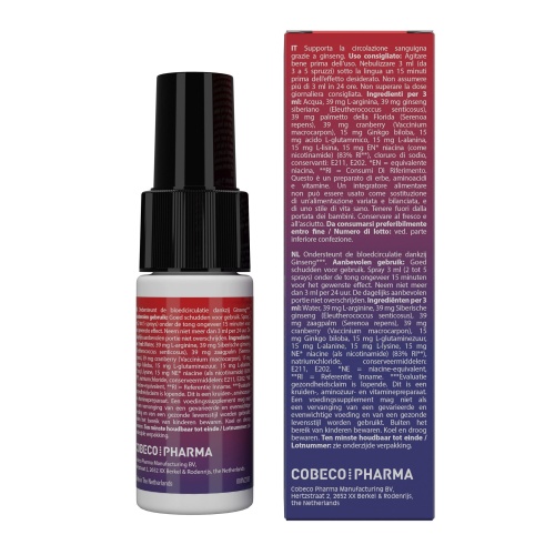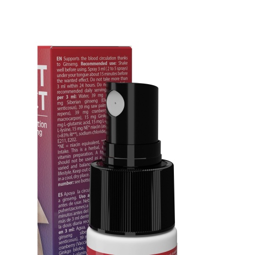 Acest spray sublingual inovator este conceput pentru bărbații care doresc un plus de încredere și performanță în momentele intime. Formulat cu extracte naturale, aminoacizi esențiali și vitamina B3 (niacină), produsul contribuie la o susținere eficientă a erecției, îmbunătățind circulația și vitalitatea generală. Ingredientul-cheie, ginsengul siberian, este bine cunoscut pentru proprietățile sale energizante și tonice, în timp ce combinația atent dozată de extracte vegetale susține funcția sexuală masculină într-un mod natural și rapid. Printre ingrediente este si Ginkgo biloba, o planta care stimulează circulația periferică și funcțiile cognitive, iar alaturi de arginina care stimuleaza vasodilatatia, produsul devine un ajutor pentru obtinerea unei erectii intense si de durata.