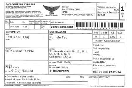 Firma de curierat ne cere sa avem o adresa pe colete, aceasta apare ca Enjoy srl, Cluj-Napoca. NU scrie pe colete www.sexshop.ro .