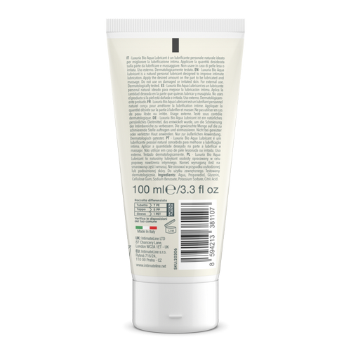 Luxuria BIO Lubrifiant Aqua 100 ml este un gel lubrifiant pe bază de apă, complet organic, care utilizează extracte naturale pentru a oferi o hidratare profundă a zonelor intime și un efect de lungă durată în timpul actului sexual. Creat pentru toate tipurile de raporturi sexuale, Luxuria BIO Aqua Lubricant te va ajuta să previi iritațiile și senzațiile de arsură în zonele expuse la un stres prelungit, menținând o lubrifiere de durată.