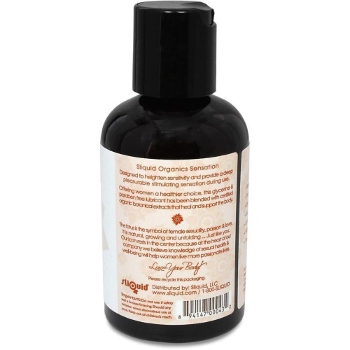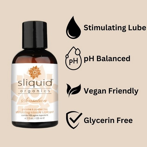 Sliquid Organic Senzatii este un lubrifiant natural pe bază de aloe. Este infuzat cu extracte botanice organice, precum și cu ingredientul activ, mentol alimentar. Sliquid Organic Senzatii este conceput pentru a spori sensibilitatea și a oferi o senzație profundă și plăcută în timpul utilizării. Această formulă stimulantă se aplică rece și se încălzește prin fricțiune. Senzația este intensă și este concepută pentru cele care doresc să adauge stimulare suplimentară la o experiență deja plăcută. Vâscozitatea Sliquid Organic Senzatii este identică cu cea a Sliquid Organic Natural și imită lubrifierea naturală a corpului tău.