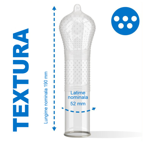 Textura: Aceste prezervative au texturi cu ”puncte” de unde si numele. Punctele sunt jumatati de cercuri mici ridicate la baza prezervativului si sunt concepute pentru placere vaginala mai profunda. Locul de amplasare a punctelor depinde de lungimea penisului in erectie, cu cat va fi mai mare in lungime cu atat vor fi mai mari, cu cat va fi mai scurta lungimea cu atat vor fi mai mici.